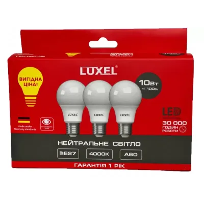 Акція! Лед-лампа 10W Е27 Люксел 3шт/уп – ідеальний вибір для вашого освітлення! Цей набір з трьох світлодіодних ламп Luxel A60 потужністю 10W забезпечить яскраве та економічне освітлення у вашому домі чи офісі. Завдяки сучасним технологіям, ці лампи є не лише ефективними, але й довговічними.