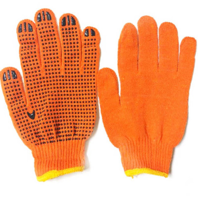 Перчатки робочі трикотажні з ПВХ, оранжеві. Виготовлені з тонкого та добре вентилируємого матеріалу. Еластичний манжет фіксує перчатку на зап'ясті, ворот манжета прошитий.