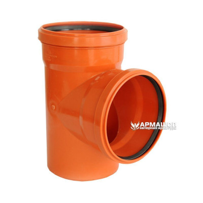 Трійник оранжевого кольору, виготовлений з високоякісного ПВХ матеріалу, призначений для каналізаційних систем. З'єднує труби діаметром 110 мм під кутом 90°, що забезпечує ефективний відвід стічних вод.