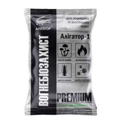 Вогнебіозахист для дерева Алігатор - це ефективний та надійний засіб, розроблений спеціально для захисту дерев'яних поверхонь від вогню та біологічних пошкоджень. Об'єм 1 кг дозволяє приготувати до 10 літрів робочого розчину, що робить його економічним вибором для великих площ.