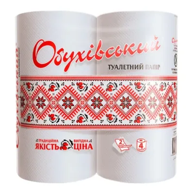 Туалетний папір Обухівський - це двошаровий целюлозний папір, що має приємне на дотик покриття. Кожен рулон містить 120 відривних листів, розмір яких складає 93 мм * 115 мм. Перфорація рулону забезпечує легке відривання необхідної довжини.