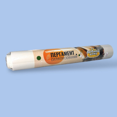 Пергамент 'Дрібниці Дома' силіконізований, призначений для випікання. Рулон має ширину 38 см та довжину 50 м. Виготовлений з харчового пергаменту білого кольору, що забезпечує безпечне використання при приготуванні їжі.